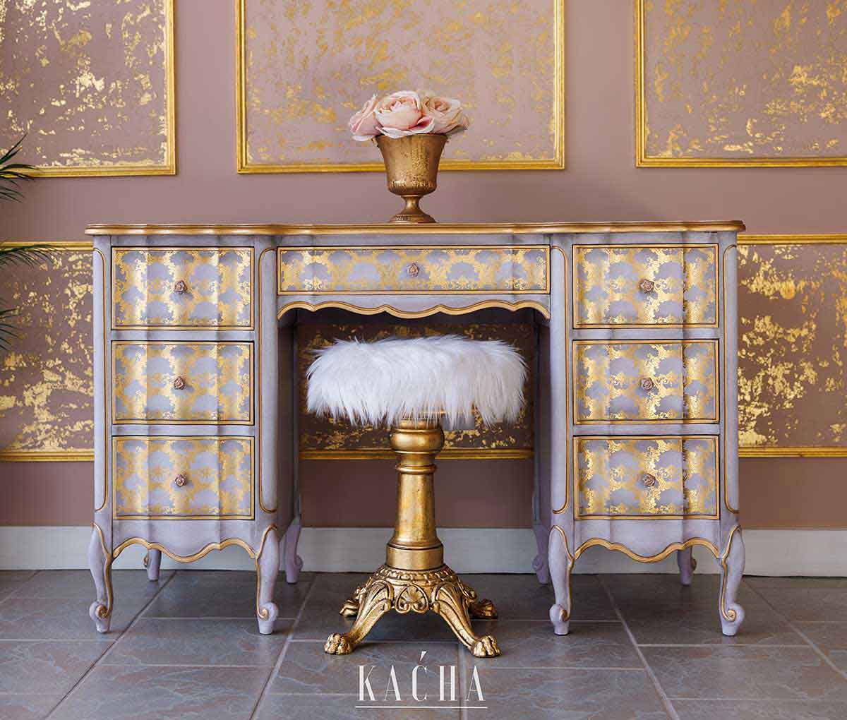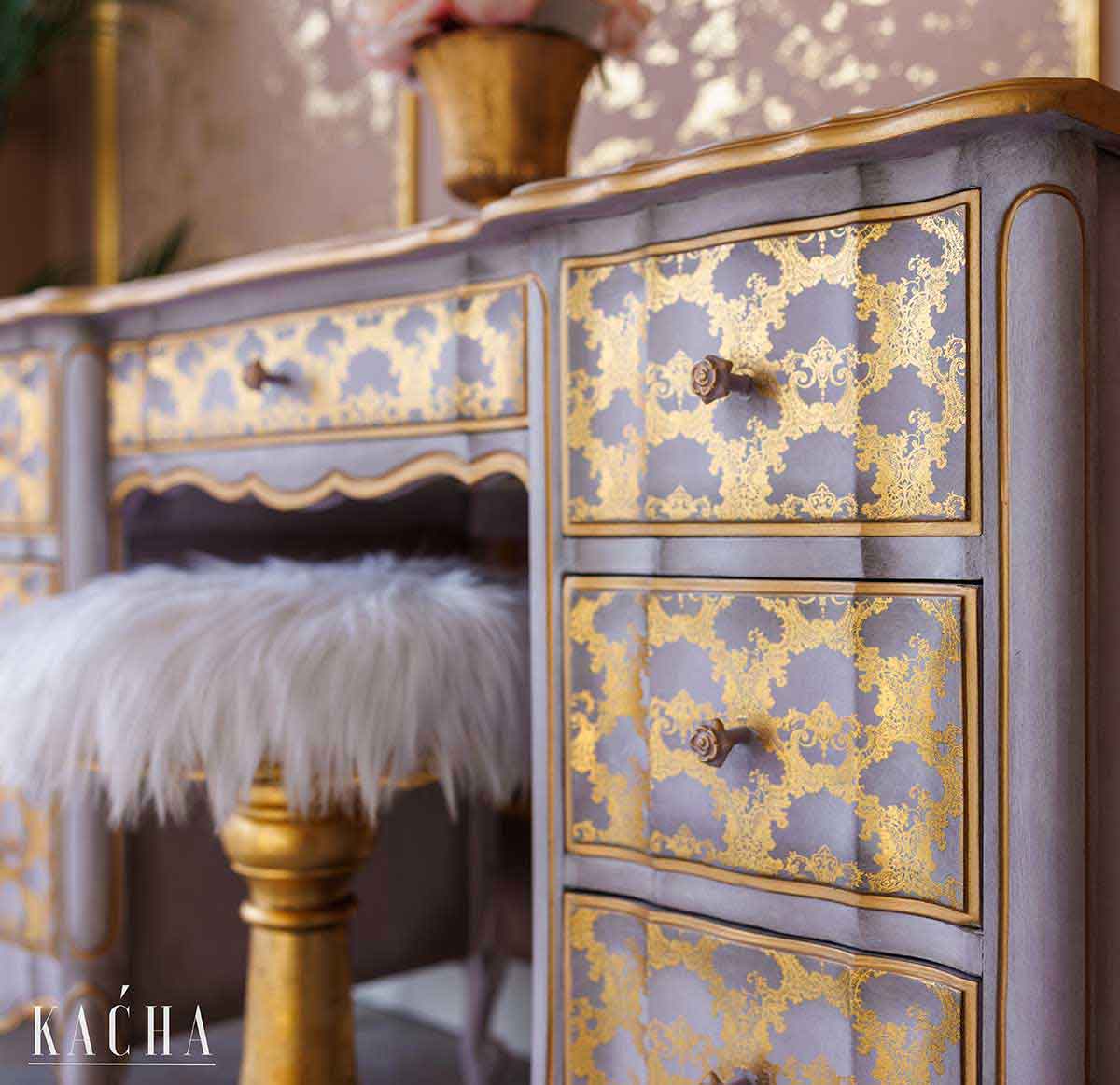 Elevate your furniture with Golden Lacework, Kácha’s exquisite take on intricate detailing. The ornate gold pattern mimics delicate lace, bringing understated luxury to dressers, cabinets, and more. This Middy Foil Transfer design pairs effortlessly with bold jewel tones or soft, neutral palettes, creating a look that’s classic yet contemporary.