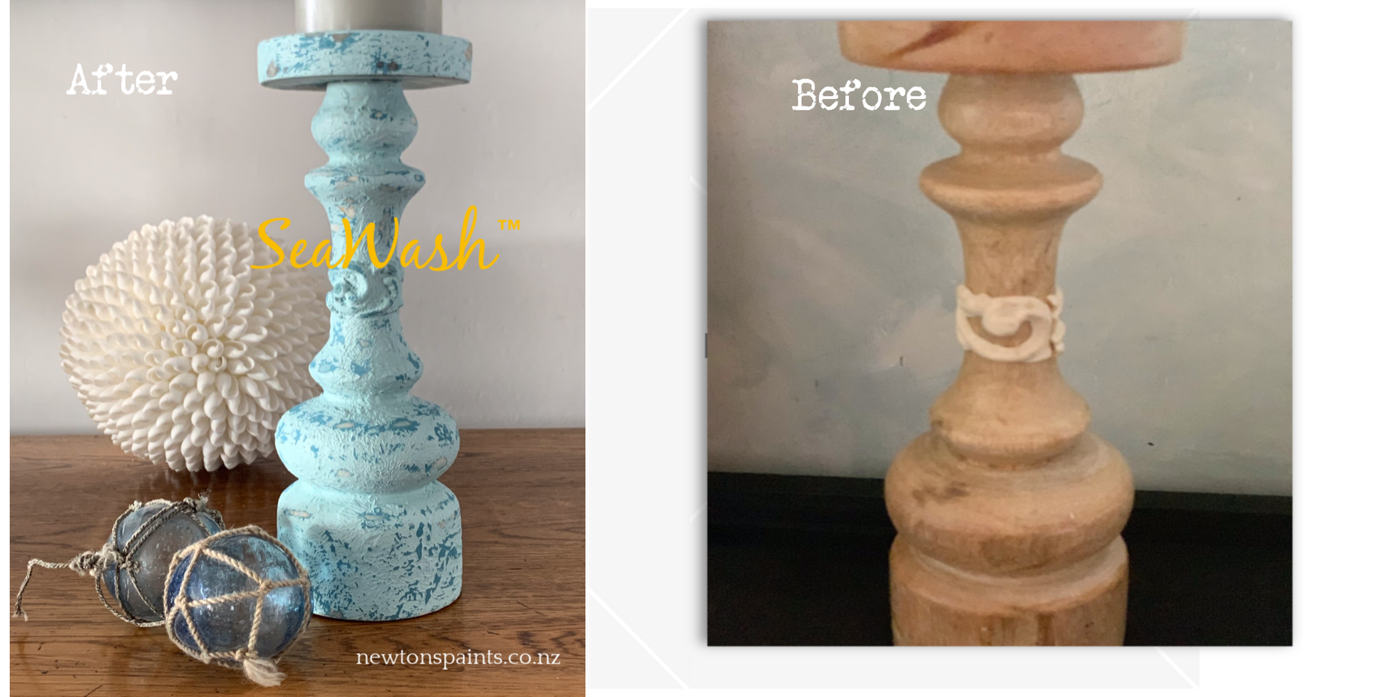 *The candlestick in the photos was created by adding SeaWash® to Newton's Chalk Finish paint colour-Byron Teal. With a top coat of Newton's Colour for Home Wall paint-Opal Surf*